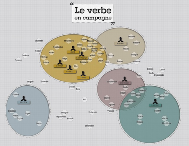 En traitant les discours avec un logiciel de text mining – technique statistique permettant d’automatiser le traitement de gros volumes de contenus texte, en isolant les tendances et les sujets évoqués par les candidats – trois des candidats à la présidentielle 2007 se détachent des autres. L’infographie ci-dessous (cliquez pour voir en grand format) répertorie visuellement les thématiques principales des orateurs. À l’image de leurs convictions, les discours sont plutôt représentatifs de leur vision politique du pays, à quelques exceptions près.